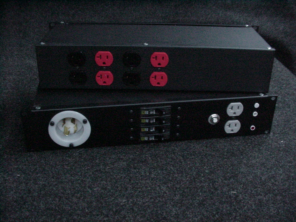 | 2U rack power module. This can be fitted with any NEMA inlet or in/thru. Or 30/60 amp pin & Sleeve inlet with no thru. there are 4 duplex edisons on the back however other connectors such as the "TT-30" RV connector used by crown, twistlocks or powercons can be fitted in their place. This unit can be built to your specifications. Call for pricing and design details. | |
