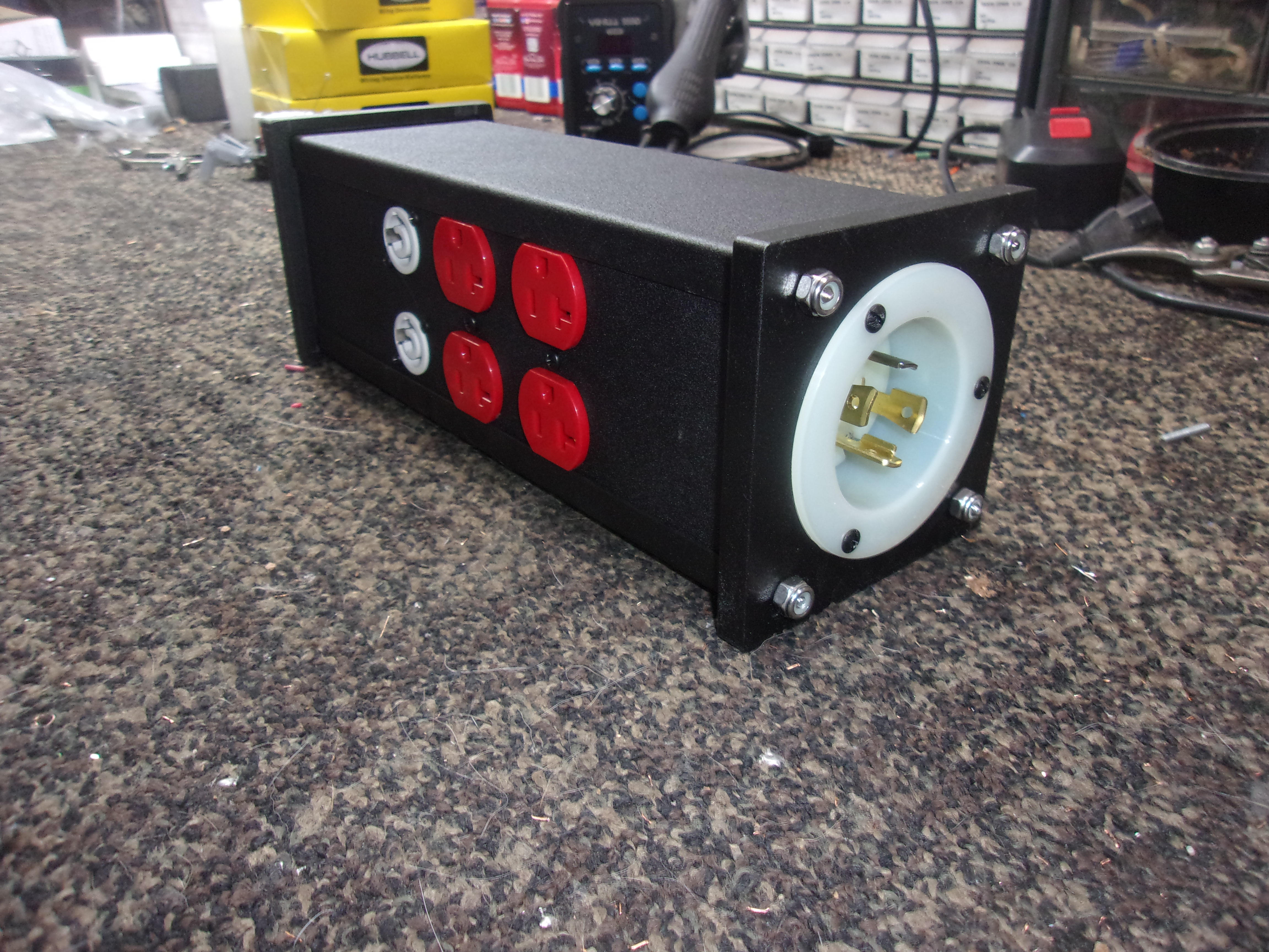 non-reflective powder coat finish. You may order this unit with more or less drops and in any length. You may specify a different inlet connector or a three-phase version with an L21-20 or other NEMA connector. Powercon and powercon true1 can also be fitted, it's also possible to mix powercon with Edisons. This unit can be built to your specifications. Call for pricing and design details. | |