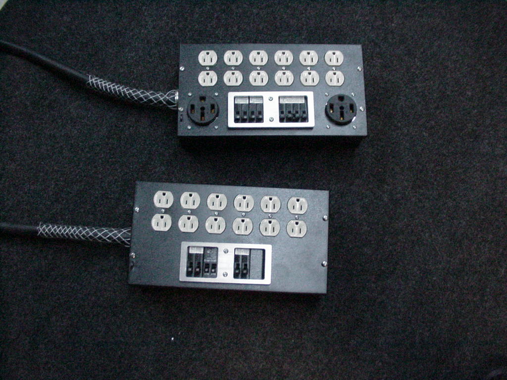 This can be fitted with any NEMA inlet or in/thru. Or 30/60/100 amp pin & Sleeve inlet with no thru. The unit shown is fitted with 6 L6-30 twist locks on the rear and 2 duplex Ediaons on the front, all on separate SquareD industrial breakers. This unit can be built to your specifications. Call for pricing and design details. | |