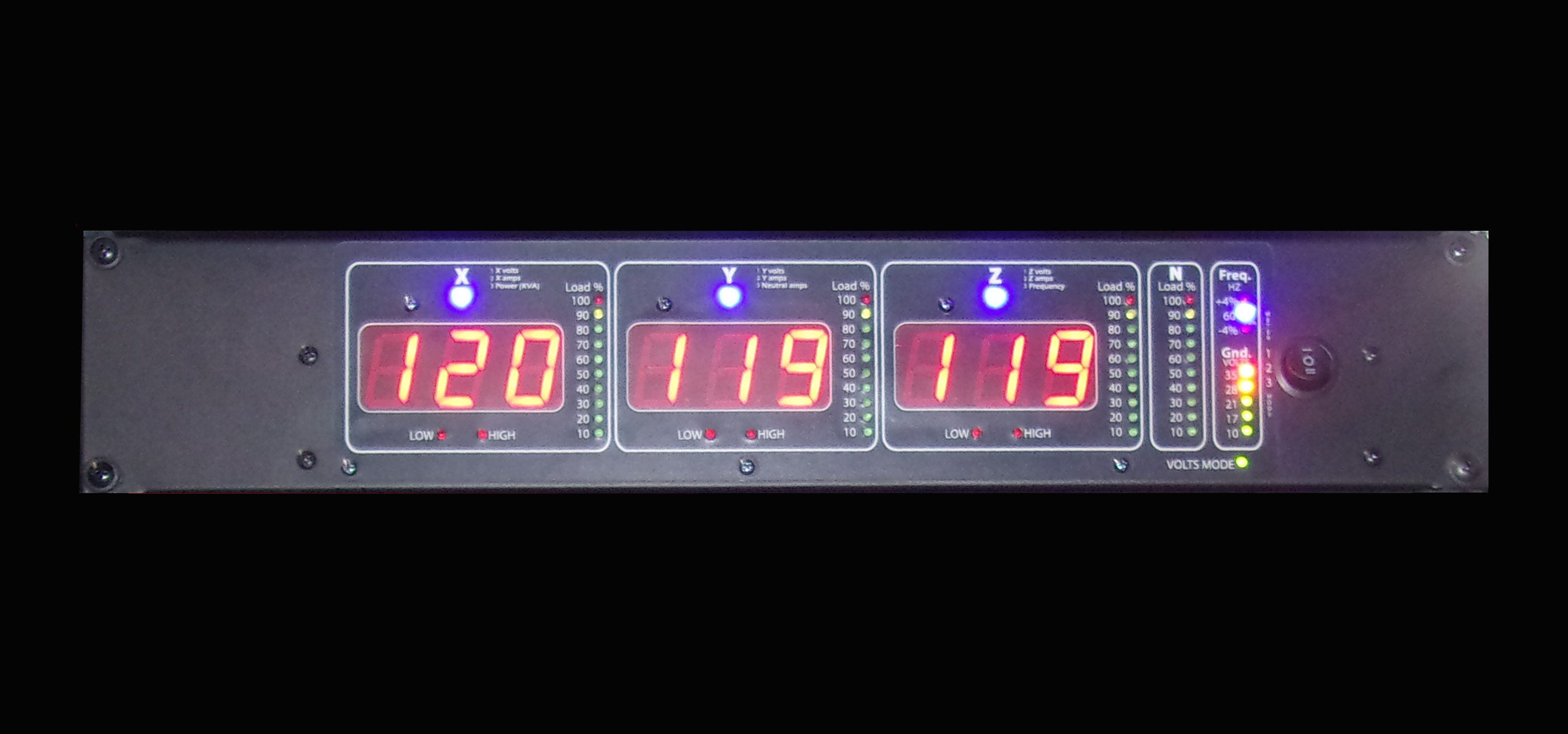 | Meter package for your power distro, one or three phase**. It has three modes of operation. In each of the three modes the digital meters will display: Mode1: from left to right ac volts for x, y, and z. Mode 2: from left to right ac amps for x, y, and z. Mode 3: from left to right Total KVA being consumed by the load, ac amps on the neutral and line frequency. There are several LED bargraph displays.From left to right indicate: X amps, Y amps, Zamps, Neutral amps, upper right Frequency, lower right Ground to Neureal volts. The unit comes with a 36" wiring harness and four current sensors. **On the single phase unit the "z" meter always reads line frequency and there is no "z" amps bargraph and only 3 current sensors. | |