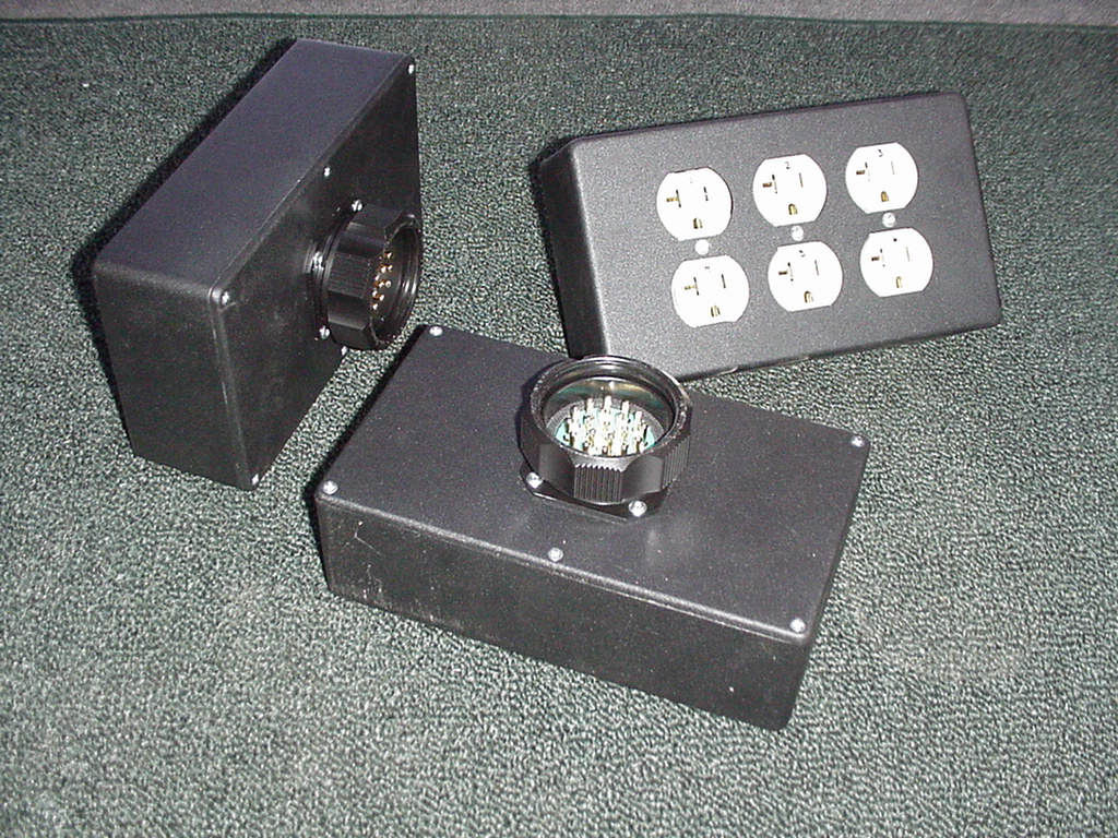 | Drop box style breakout. Sometimes called a power brick. Small, rugged and low cost. Very flexible design allows almost any configuration of connectors, inlets or in/thru including pin & sleeve. Circuit breakers can also be fitted if needed. This unit can be built to your specifications. Call for pricing and design details. | |
